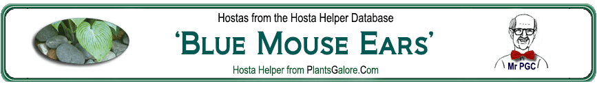 | 'Holy Mouse Ears' | TC Sport | 'Royal Mouse Ears' | - | Zilis, Mark & Deckert, Emile & Deckert, Jane | (GENETIC BACKGROUND) 'Aden No. 359', 'Blue Cadet', 'Blue Mouse Ears', 'Royal Mouse Ears', 'Tokudama' ++(SIBLING.by.HYBRID) 'Frosted Mouse Ears' ++(SIMILAR.HOSTAS) 'Desert Mouse', 'Mighty Moe', 'Mighty Mouse', 'Minerva Mouse Ears', 'Mouse Trap', 'Pure Heart', 'Snow Mouse' |