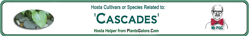 | 'Abbey Pond Cascades' | Hybrid | 'Cascades' | Unknown | Malloy, Alex | (GENETIC BACKGROUND) 'Banana Sundae', 'Cascades', 'Fortunei', 'Elegans', 'Frances Williams', 'Sieboldiana' ++(SIMILAR.HOSTAS) 'Jade Cascade' |