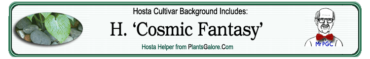 | 'Cosmic Fantasy' | Hybrid | Complex Cross | 'Frosted Morning' | Kuenster, Rod | (GENETIC BACKGROUND) 'Beer Belly Blues', 'Cosmic Hippie', 'Dorothy Benedict', 'Elegans', 'Frances Williams', 'Frosted Morning', 'Sieboldiana' |