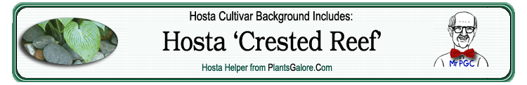 | 'Crested Reef' | Hybrid | 'August Moon' | 'Ruffles' | Minks, Eldren | (GENETIC BACKGROUND) 'August Moon', 'Ruffles' ++(SIMILAR.HOSTAS) 'Permanent Wave' |