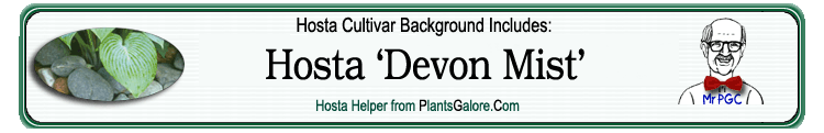 | 'Devon Mist' | Hybrid | 'Buckshaw Blue' | Unknown | Bowden, Roger & Ruh, Peter | (GENETIC BACKGROUND) 'Buckshaw Blue', 'Sieboldiana', 'Tokudama' ++(SIMILAR.HOSTAS) 'Academy Devon Moor', 'Academy Mavrodaphne', 'Blue Wedgwood', 'Ice Prancer' |