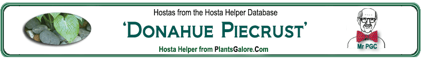 | 'Donahue Piecrust' | Hybrid | Hosta montana - | Unknown | Donahue, Thomas & Ruh, Peter | (GENETIC BACKGROUND) 'Fortunei', 'Fortunei Gigantea' (Possibly), 'Green Piecrust' (Possibly), Hosta montana ++(SIMILAR.HOSTAS) 'Devon Discovery', 'Green Ripples', 'Mesa Fringe', 'Sea Current', 'Sea Drift', 'Split Decision', 'Grey Piecrust', 'Lake Superior', 'Queen of the Seas' |