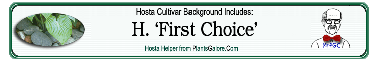 | 'First Choice' | Hybrid | 'Pin Stripe Sister' | Unknown | Malloy, Alex | (GENETIC BACKGROUND) 'Beatrice', 'Breeder's Choice', 'Elegans', 'Frances Williams', 'Pin Stripe Sister', 'Sieboldiana', Hosta sieboldii ++(SIMILAR.HOSTAS) 'Avalon', 'Frog School', 'Kismet' |