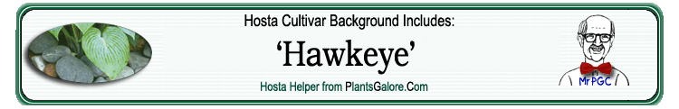 | 'Hawkeye Gold' | Sport | 'Gold Edger' | - | Simmering, Ron | (GENETIC BACKGROUND) 'Aden No. 359', 'Aden No. 381', 'Blue Cadet', 'Gold Cadet', 'Gold Edger', Hosta nakaiana (Possibly), 'Tokudama' ++(SIMILAR.HOSTAS) 'Drip Drop', 'Hawkeye', 'Radiant Edger' |