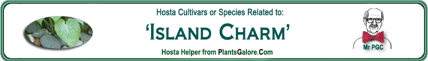 | 'Island Charm' | Hybrid | 'Flamboyant' | Unknown | Rassmussen, George & Malloy, Alex | (GENETIC BACKGROUND) 'Flamboyant' ++(SIMILAR.HOSTAS) 'Masquerade', 'Peanut' |