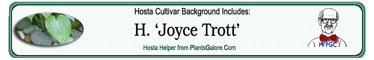 | 'Joyful' | TC Sport | 'Joyce Trott' | - | Zilis, Mark | (GENETIC BACKGROUND) 'Bengee', 'Flamboyant', 'Joyce Trott', Hosta nigrescens, 'Sum and Substance', 'Tokudama', 'Tokudama Aureonebulosa' |
