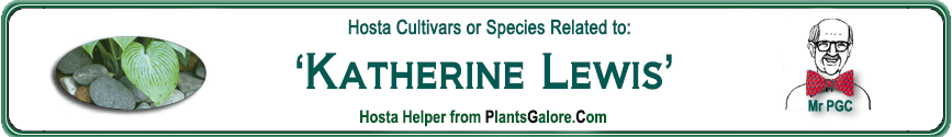 | 'Katherine Lewis' | Hybrid | 'Halcyon' | Unknown | Lewis, Alan | (GENETIC BACKGROUND) 'Elegans', 'Halcyon', Hosta longipes, Hosta longipes lancea, 'Sieboldiana', Tardiflora' ++(SIMILAR.HOSTAS) 'June' |