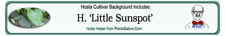 | 'Little Sunspot' | Sport | 'Little Aurora' | - | Briggs Nursery-WA | (GENETIC BACKGROUND) 'Golden Waffles', 'Little Aurora', 'Tokudama', 'Tokudama Aureonebulosa' ++(SIMILAR.HOSTAS) 'Amy Elizabeth', 'Delia', 'Not So', 'Just So', 'Wylde Green Cream' |