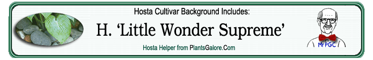 | 'Little Wonder Supreme' | Sport | 'Little Wonder' streaked | - | Lachman, Wm & Lachman, Eleanor | (GENETIC BACKGROUND) 'Aden No. 270', 'Aden No. 275', 'Fortunei', 'Fortunei Robusta', 'Little Wonder', 'Neat Splash', Hosta sieboldii, 'Yellow Splash' |
