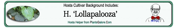 | 'Lollapalooza' | Hybrid | 'Galaxy' | Unknown | Elslager, Ed | (GENETIC BACKGROUND) 'Beatrice', 'Elegans', 'Frances Williams', 'Galaxy', 'Sieboldiana', Hosta sieboldii ++(SIMILAR.HOSTAS) 'Bluegrass Country' |