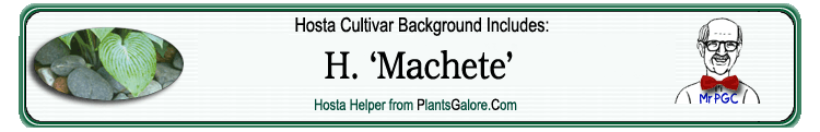 | 'Machete' | Sport | 'Ginsu Knife' | - | Solberg, Robert | (GENETIC BACKGROUND) 'Ginsu Knife', 'Green Fountain', 'Green Wedge' (Shaw), 'Oron Gate Supreme', Hosta longipes, Hosta nigrescens, Hosta plantaginea, 'Tokudama', 'Tokudama Aureonebulosa' |
