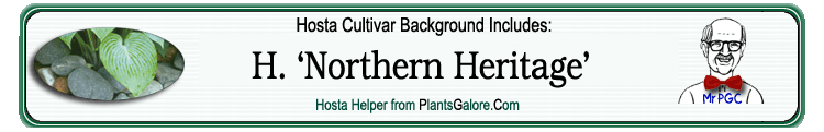 | 'Northern Heritage' | Hybrid | 'Color Fantasy' | 'Big Daddy' | Dean, Don | (GENETIC BACKGROUND) 'Big Daddy', 'Color Fantasy', 'Elegans', 'Fortunei', 'Gala', Hosta longipes, Hosta longipes lancea, 'Robusta', 'Sieboldiana', 'Tardiflora' |