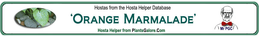 | 'Marmalade on Toast' | Sport | 'Orange Marmalade' | - | Fransen, Marco & Fransen, Joyce | (GENETIC BACKGROUND) 'Fortunei', 'Orange Marmalade', 'Paul's Glory', 'Perry's True Blue', 'Sieboldiana' ++(SAME.AS) 'Chart Topper' (Probably) ++(INFO.SOURCE: Hosta Library) |