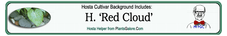 | 'Red Cloud' | Hybrid | 'Neat Splash' | 'Riptide' | Beilstein, Doug & The American Hosta Society | (GENETIC BACKGROUND) 'Aden No. 270', 'Aden No. 275', 'Fortunei', 'Fortunei Robusta', 'Neat Splash', Hosta pycnophylla, 'Sieboldiana' (Possibly), Hosta sieboldii, Tardiana Type (Possibly), 'Tokudama' (Possibly) 'Yellow Splash' |