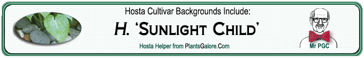 | 'Sunlight Child' | Hybrid | 'Golden Hawk' | 'Golden Hawk' | Benedict, Dr Ralph (Herb) | (GENETIC BACKGROUND) 'Elegans', 'Golden Hawk', 'Hadspen Hawk', Hosta longipes, Hosta longipes lancea, 'Sieboldiana', 'Tardiflora' |