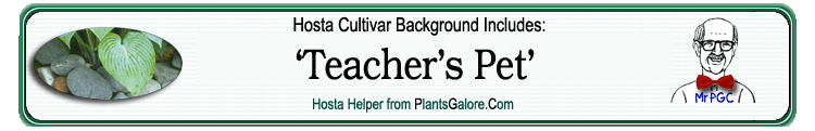 | 'Teacher's Pet' | Hybrid | 'Dorothy Benedict' | Hosta montana - | Asch, Stuart | (GENETIC BACKGROUND) 'Dorothy Benedict', 'Elegans', 'Frances Williams', Hosta montana, 'Sieboldiana' ++(TYPE) 'Elegans', 'Sieboldiana' |