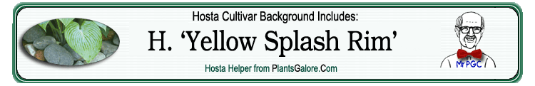 | 'Yellow Splash Rim' | Sport | 'Yellow Splash' | - | The American Hosta Society | (GENETIC BACKGROUND) 'Aden No. 270', 'Aden No. 275', 'Yellow Splash' ++(SIMILAR.HOSTAS) 'Bob Olson', 'Bold Ribbons', 'Minnie Bell', 'Neat Splash Rim', 'Queen Josephine', 'Yellow Splash Edge' |