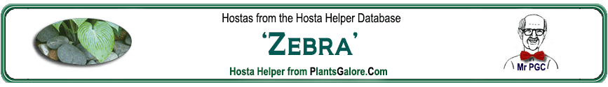 | 'Zebra' | Unknown | - | - | Seaver, Mildred | (SIMILAR.HOSTAS) 'Sea Surprise', 'Sea Zebra' |