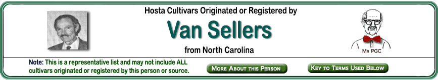 | 'Iron Gate Glamour' | Large | Med-Green | Marginal | White | Hybrid | Pale-Lavender | August | Sellers, Van | .1981 |