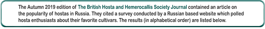 | 'Halcyon' | Medium | Blue/Green | | | Hybrid | Pale-Lavender | July to August | Smith, Eric & The American Hosta Society | .1988 |