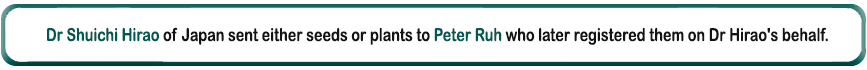 | 'Hirao Monument' | Medium | Light-Green | | | Unknown | Pale-Lavender | August to September | Hirao, Shuichi & Ruh, Peter | .2001 |