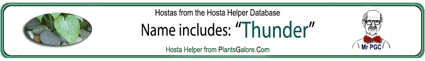 | 'Sea Thunder' | Large | Dark-Green | Medial | White | Sport | Light-Purple | July to August | Seaver, Mildred & Walek, Kevin & The American Hosta Society | .2009 |