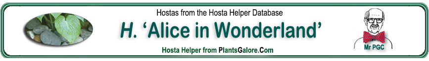 | 'Alice In Wonderland' | Hybrid | 'Flamboyant' | 'Banana Sundae' | Malloy, Alex | (GENETIC BACKGROUND) 'Banana Sundae', 'Flamboyant', 'Fortunei' ++(SIMILAR.HOSTAS) 'Gold Standard' |