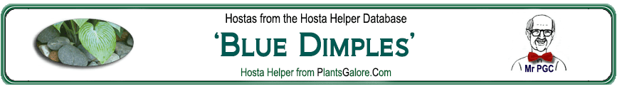 | 'Frosted Dimples' | Hybrid | 'Blue Dimples' | 'Silver Frost' | Dean, Don | (GENETIC BACKGROUND) 'Blue Dimples', 'Elegans', Hosta longipes, Hosta longipes lancea, 'Sieboldiana', 'Silver Frost', 'Tardiflora' |