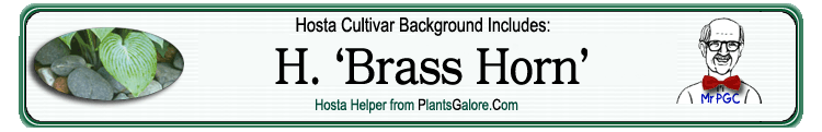 | 'Brass Horn' | Sport | 'Fortunei Stenantha' | - | Walden West Nursery | (GENETIC BACKGROUND) 'Fortunei', 'Fortunei Stenantha' ++(SAME.AS) 'Fool's Gold' ++(DUPLICATE/INCORRECT.NAME) Hosta fortunei stenantha aureo-marginata, 'Fortunei Stenantha Aureomarginata' |