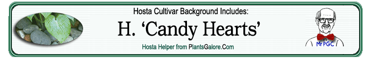 | 'Candy Hearts' | Hybrid | Hosta nakaiana | Unknown | Fisher, Eunice V. & Ruh, Peter | (GENETIC BACKGROUND) Hosta nakaiana ++(SIMILAR.HOSTAS) 'Bountiful', 'Goldbrook Genie', 'Happy Hearts', 'Heartleaf', 'Minnie Klopping', 'Pearl Lake', 'Peace Offer', 'Pinky' |