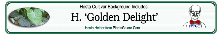 | 'Golden Delight' | Hybrid | 'Wayside Blue' | Unknown | Kuk, Bob | (GENETIC BACKGROUND) 'Tokudama', 'Wayside Blue' ++(SIMILAR.HOSTAS) 'Jim Cooper' |