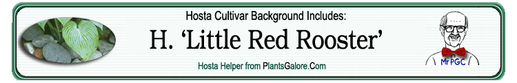 | 'Little Red Rooster' | Hybrid | 'Wiggle Worms' | 'Red Sox' | Van Eechaute, Danny | (GENETIC BACKGROUND) Hosta longipes, Hosta longipes hypoglauca, Hosta longipes latifolia, 'Maruba Iwa', 'Red Sox', 'Wiggle Worms' |