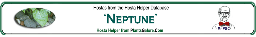 | 'Neptune's Chariot' | Hybrid | 'Neptune' | 'Fleet Week' | Goodenough, Rick | (GENETIC BACKGROUND) 'Dorset Blue', 'Elegans', 'Fleet Week', 'Fortunei', 'Fortunei Gigantea', 'Green Piecrust', 'Halcyon', Hosta hypoleuca, Hosta longipes, Hosta longipes lancea, 'Maekawa', Hosta montana, Hosta montana macrophylla, 'Neptune', 'Niagara Falls', 'Salute', 'Sea Drift', 'Sieboldiana, 'Tardiflora' |