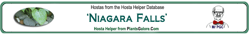 | 'Kabigan Falls' | Hybrid | 'Niagara Falls' | Unknown | Van den Top, Jan | (GENETIC BACKGROUND) 'Fortunei', 'Fortunei Gigantea', 'Green Piecrust', Hosta montana, Hosta montana macrophylla, 'Niagara Falls', 'Sea Drift' |