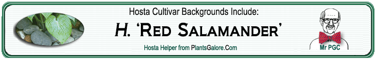 | 'Red Salamander' | Unknown | - | - | Seaver, Mildred | (SIMILAR.NAME) 'Sea Red Salamander' ++(SIMILAR.HOSTAS) 'Raspberry Sorbet', 'Sea Red Salamander' |