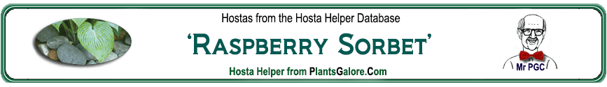 | 'Raspberry Sorbet Supreme' | TC Sport | 'Raspberry Sorbet' | - | Schwarz, Jim | (GENETIC BACKGROUND)'Raspberry Sorbet', 'Rock Master', Hosta rupifraga, 'Shining Tot', Hosta venusta ++(SIMILAR.HOSTAS) 'Raspberry Truffle' |