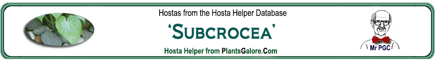 | 'Subcrocea' | Unknown | - | - | The American Hosta Society | (GENETIC BACKGROUND) Hosta sieboldii ++(SIMILAR.HOSTAS) 'Bitsy Gold', 'Chartreuse Wiggles', 'Estrellita', 'Golden Kabitan', 'Ground Sulphur', 'Ki Kabitan', 'Lights Up', 'Purple and Gold', 'Rosanne', 'Sea Wiggles', 'Wogon Gold', 'Yellow Eyes' |