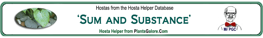 | 'Sum it Up' | TC Sport | 'Sum and Substance' | - | Zilis, Mark | (GENETIC BACKGROUND) 'Bengee', Hosta nigrescens, 'Sum and Substance', 'Tokudama', 'Tokudama Aureonebulosa' ++(SIMILAR.HOSTAS) 'Lady Isobel Barnett', 'Sum Total', 'Tiffney's Godzilla' |