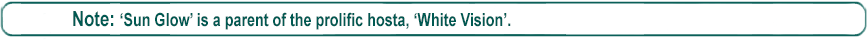 | 'White Vision' | Hybrid | 'Sun Glow' | 'Gold Cup' | Aden, Paul | (GENETIC BACKGROUND) 'Aden No. 370', 'Aspen Gold', 'Gold Cadet', 'Gold Cup', 'Golden Prayers', 'Golden Waffles', 'Sun Glow', 'Tokudama', 'Tokudama Aureonebulosa' ++(SIMILAR.HOSTAS) 'August Moon', 'Golden Prayers', 'Zounds' |