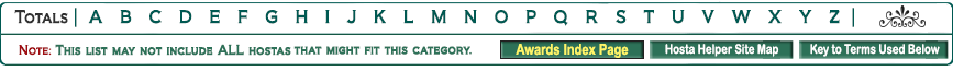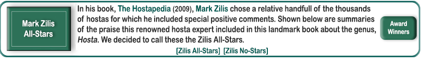 | 'August Moon' | Large | Yellow | | | Langfelder, Richard & Ruh, Peter | Zilis Comment: "...ranks as one of the oldest and most greatly admired of all gold-leaved hostas. Every collector recognizes this plant..." |