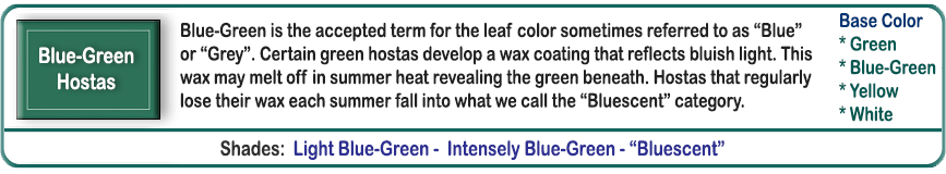 | 'Abiqua Blue Shield' | Blue/Green | Large | | | Unknown | Near-White | June to July | Walden West Nursery | .1988 |