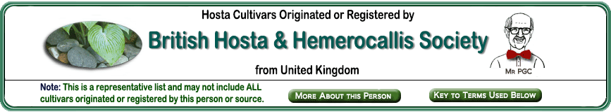 | 'Kite' | Medium | Blue/Green | | | Unknown | Unknown | Unknown | Smith, Eric & British Hosta and Hemerocallis Society | .1988 |
