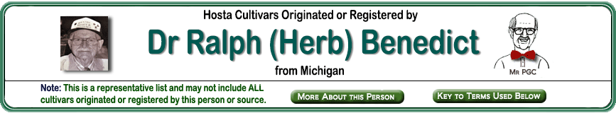 | 'Amethyst Chip' | Miniature | Blue/Green | | | Hybrid | Pale-Lavender | July to August | Benedict, Dr Ralph (Herb) & Benedict, Dorothy | .2000 |
