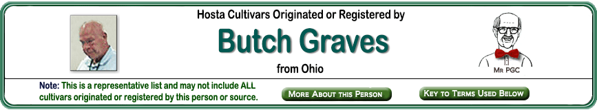 | 'Uncle Hirsch' | Unknown | Blue/Green | Marginal | Yellow | Hybrid | Unknown | August to September | Graves, Butch | .2008 |