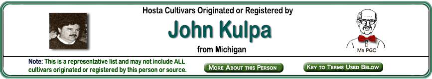 | 'Ann Kulpa' | Large | Med-Green | Medial | White | Hybrid | Near-White | July to August | Kulpa, John | .1999 |