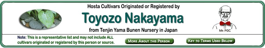 | 'Yaburitsugi' | Medium | Dark-Green | | | Unknown | Unknown | Unknown | Nakayama, Toyozo & Lydell, Ransom & Walek, Kevin & The American Hosta Society | .2009 |