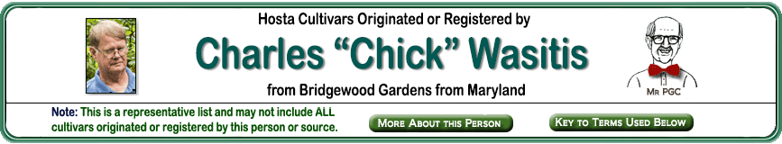 | 'Cathy's Clown' (Wasitis) | Medium | Med-Green | Marginal | White | Unknown | Unknown | June to July | Wasitis, Chick | .2011 |