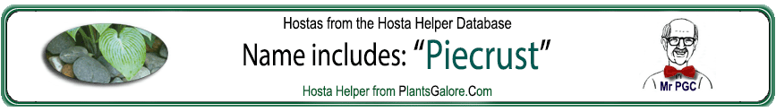| 'Grey Piecrust' | Giant | Blue/Green | | | Hybrid | Pale-Lavender | June to July | Donahue, Thomas & The American Hosta Society | .1986 |