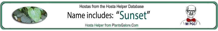 | 'Hydon Sunset' (George) | Small | Yellow | | | Hybrid | Deep-Purple | July | George, Arthur & British Hosta and Hemerocallis Society | .1988 |