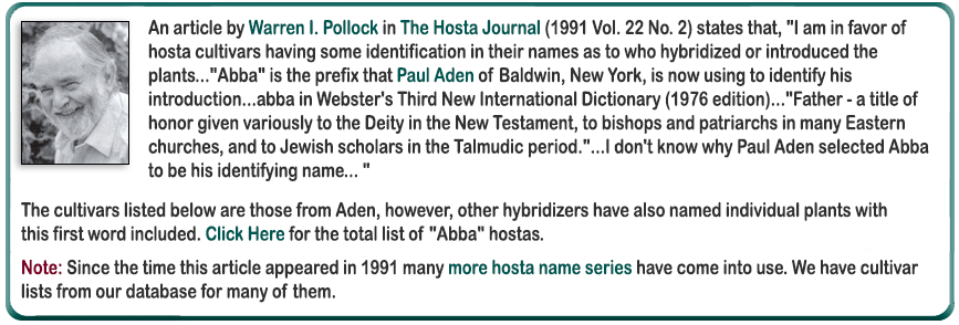 | 'Abba Ready' | Medium | Med-Green | Marginal | White | Sport | Pale-Lavender | July to August | Zilis, Mark & The American Hosta Society & Aden, Paul | .2010 |